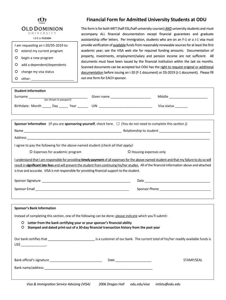 Financial Form for Admitted University Students at ODD I am requesting an I20/DS2019 to: extend my current program begin a new program add a dependent/dependents change my visa status other: This