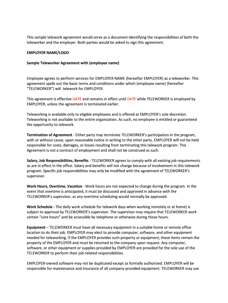 This sample telework agreement would serve as a document identifying the responsibilities of both the teleworker and the employer. Both parties would be asked to sign this agreement. EMPLOYER NAME/LOGO