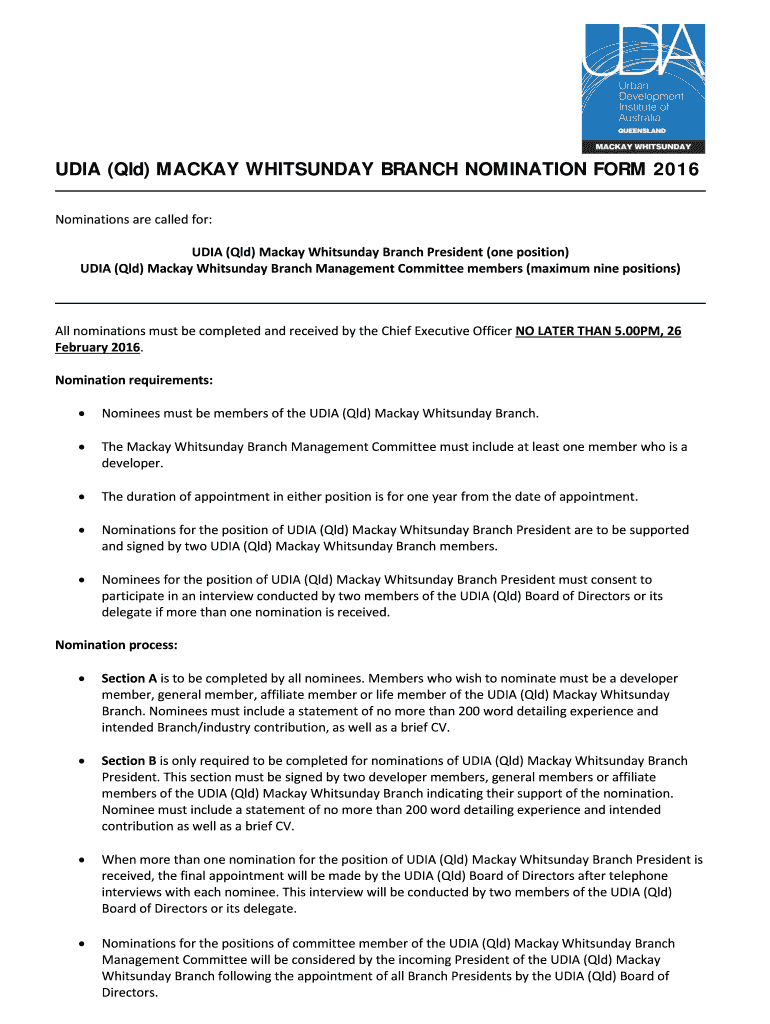 USIA (QLD) MACKAY WHITSUNDAY BRANCH NOMINATION FORM 2016 Nominations are called for: USIA (QLD) Mackay Whitsunday Branch President (one position) USIA (QLD) Mackay Whitsunday Branch Management Committee