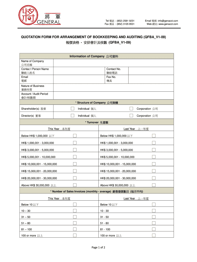Tel : (852) 2581 9231 Fax : (852) 3105 9531 Email : info genacct.com Web : www.genacct.com QUOTATION FORM FOR ARRANGEMENT OF BOOKKEEPING AND AUDITING (QF BA V109) (QF BA V109) Information of Company