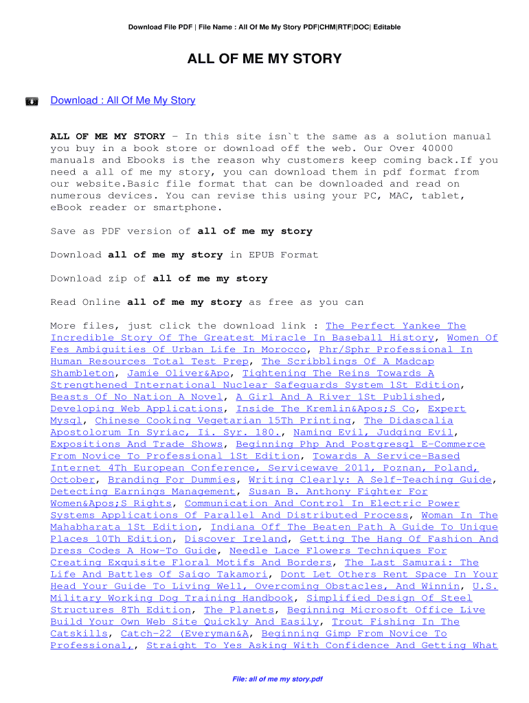 Download File PDF File Name : All Of Me My Story PDF CHM RTF DOC Editable ALL OF ME MY STORY Download : All Of Me My Story ALL OF ME MY STORY In this site isn't the same as a solution manual you buy