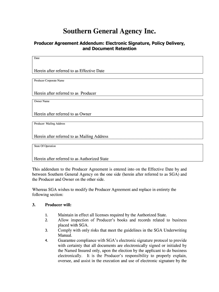 The Producer Agreement Addendum is a legal document used by Southern General Agency (SGA) and Producers to modify terms of the Producer Agreement for compliance and operational clarity.
