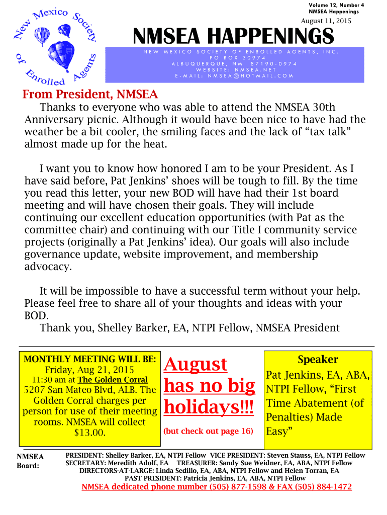 Volume 12, Number 4 NM SEA Happenings August 11, 2015, NM SEA HAPPENINGS NEW MEXICO SOCIETY OF ENROLLED AGENTS, INC. PO BOX 30974 ALBUQUERQUE, NM 871900974 WEBSITE: NM SEA.NET EMAIL: NM SEA HOTMAIL.COM