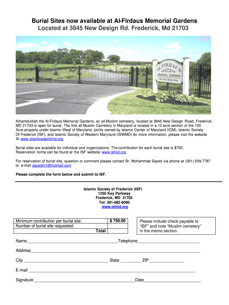 Burial Sites now available at AlFirdaus Memorial Gardens Located at 3845 New Design Rd. Frederick, Md 21703 Alhamdulillah the AlFirdaus Memorial Gardens, an all Muslim cemetery, located at 3845 New