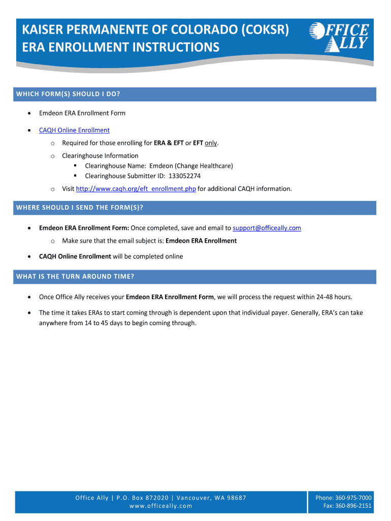 KAISER PERMANENT OF COLORADO (COKSR) ERA ENROLLMENT INSTRUCTIONS WHICH FORM(S) SHOULD I DO? Eden ERA Enrollment Form CASH Online Enrollment o Required for those enrolling for ERA & EFT or EFT only.
