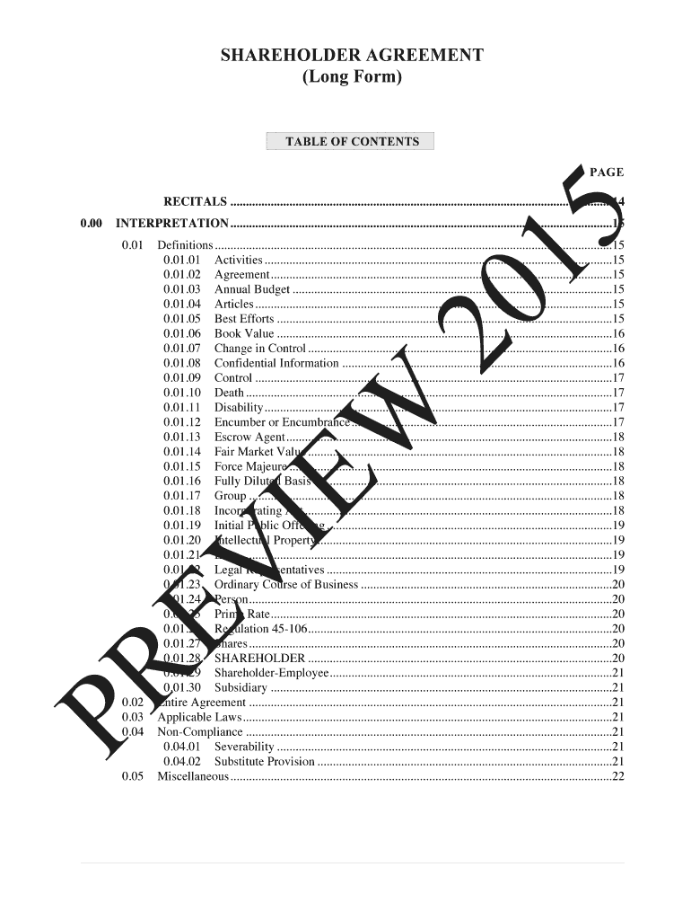 SHAREHOLDER AGREEMENT (Long Form) TABLE OF CONTENTS PAGE 20 15 RECITALS ...........................................................................................................................