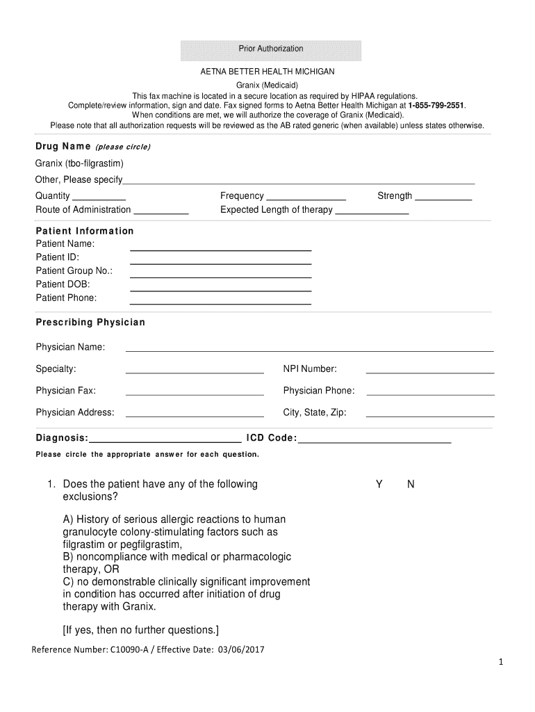 Prior Authorization AETNA BETTER HEALTH MICHIGAN Gran ix (Medicaid) This fax machine is located in a secure location as required by HIPAA regulations. Complete/review information, sign and date. Fax