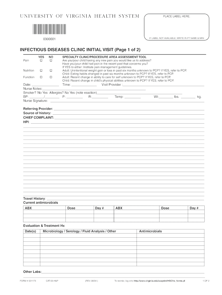 The Infectious Diseases Clinic Initial Visit Form is a crucial document utilized by healthcare providers within the University of Virginia Health System. This form plays a significant role in assessing patients with infectious diseases by ensuring comprehensive evaluation during their initial visit. It requires a nurse's signature to validate the assessment, underscoring its importance in patient care.