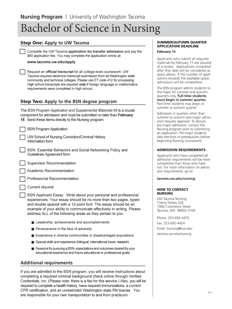 Nursing Program University of Washington Tacoma Bachelor of Science in Nursing Step One: Apply to UW Tacoma Complete the UW Tacoma application for transfer admission and pay the $60 application fee.