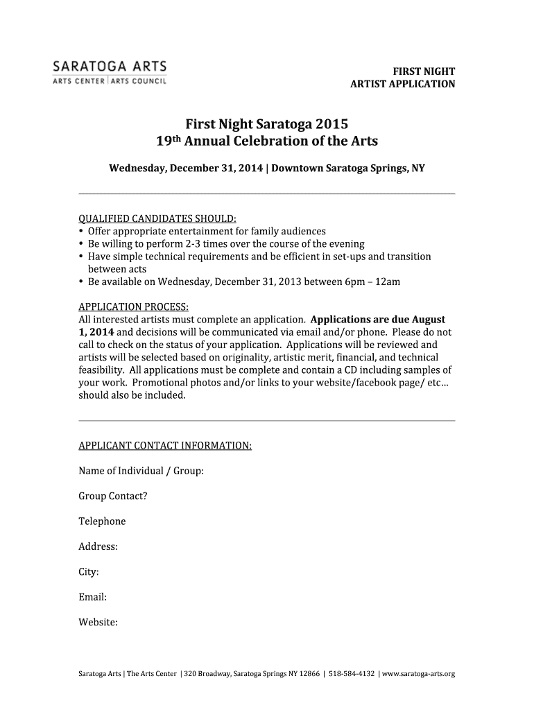 FIRST NIGHT ARTIST APPLICATION First Night Saratoga 2015 19th Annual Celebration of the Arts Wednesday, December 31, 2014, Downtown Saratoga Springs, NY QUALIFIED CANDIDATES SHOULD: Offer appropriate