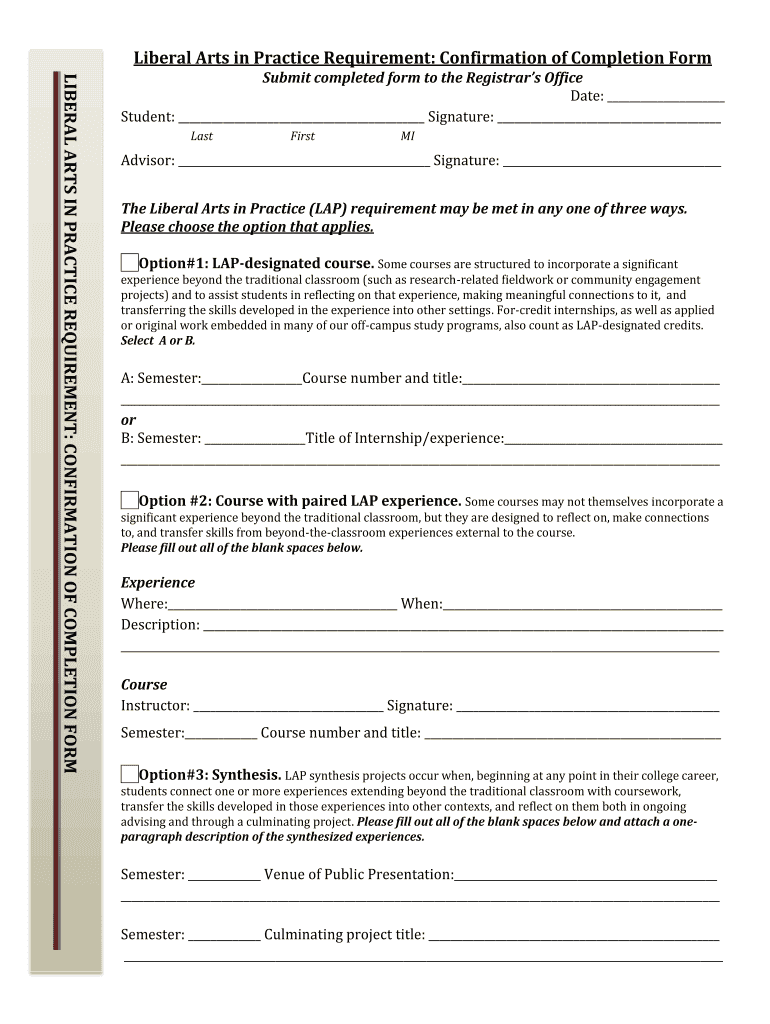 The Liberal Arts in Practice Confirmation Form (LAP confirmation form) serves as a vital document for students to verify their completion of liberal arts requirements. This form requires students to confirm their academic achievements, ensuring that their educational journey aligns with graduation standards. By completing this form, students play an essential role in maintaining accurate academic records and fulfilling graduation prerequisites.