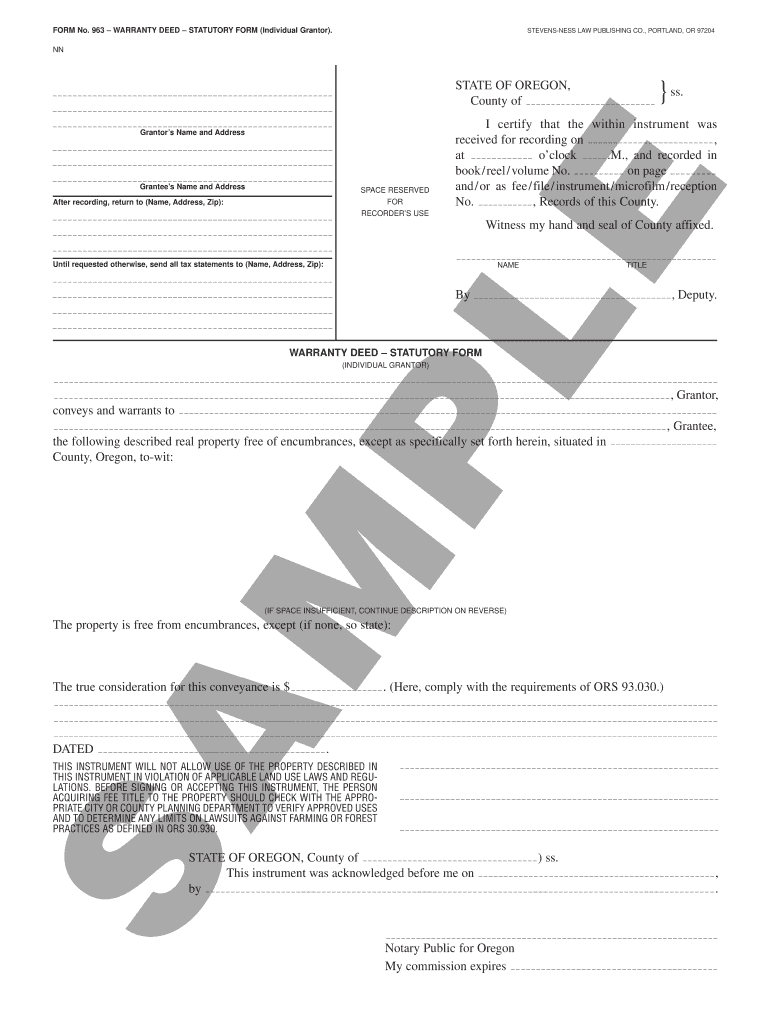 FORM No. 963 WARRANTY DEED STATUTORY FORM (Individual Granter). STEEPNESS LAW PUBLISHING CO., PORTLAND, OR 97204 IN STATE OF OREGON, County of Grantees Name and Address SPACE RESERVED FOR RECORDERS