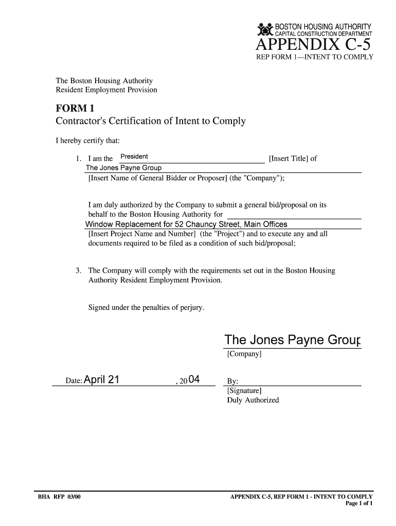 BOSTON HOUSING AUTHORITY CAPITAL CONSTRUCTION DEPARTMENT APPENDIX C5 REP FORM 1INTENT TO COMPLY The Boston Housing Authority Resident Employment Provision FORM 1 Contractor's Certification of Intent