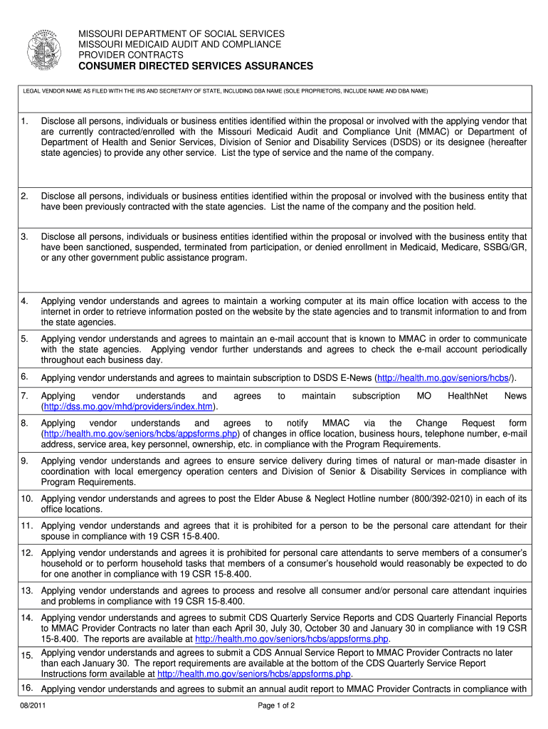 MISSOURI DEPARTMENT OF SOCIAL SERVICES MISSOURI MEDICAID AUDIT AND COMPLIANCE PROVIDER CONTRACTS CONSUMER DIRECTED SERVICES ASSURANCES LEGAL VENDOR NAME AS FILED WITH THE IRS AND SECRETARY OF STATE,