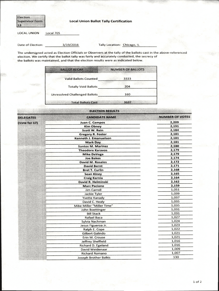 Election Supervisor Form Local Union Ballot Tally Certification 13 LOCAL UNION Date of Election: Local 705 Tally Location: Chicago, IL 3/19/2016 The undersigned acted as Election Officials or Observers