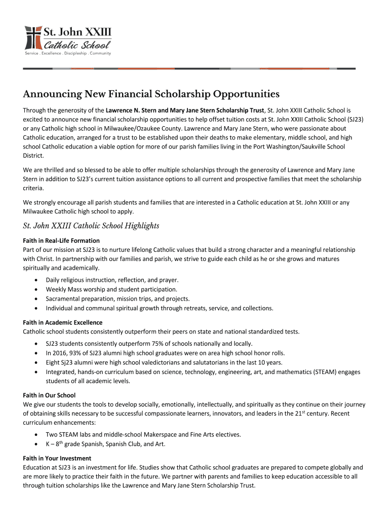 Through the generosity of the Lawrence N. Stern and Mary Jane Stern Scholarship Trust, St. John XXIII Catholic School is
