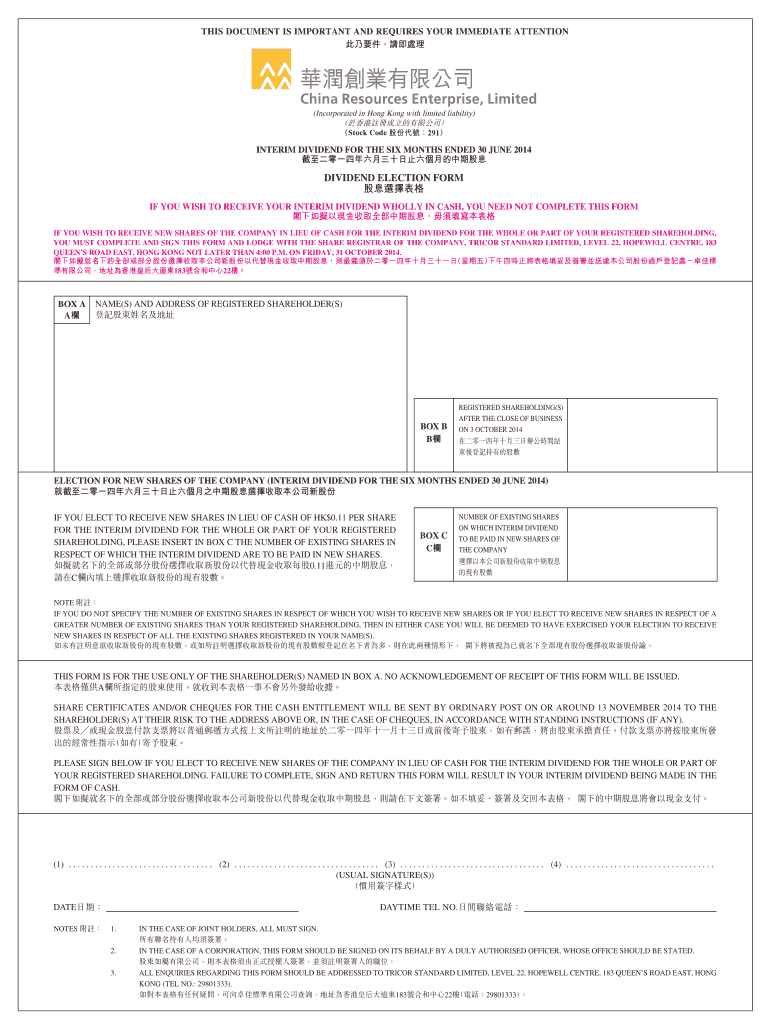 THIS DOCUMENT IS IMPORTANT AND REQUIRES YOUR IMMEDIATE ATTENTION (Incorporated in Hong Kong with limited liability) Stock Code 291 INTERIM DIVIDEND FOR THE SIX MONTHS ENDED 30 JUNE 2014 DIVIDEND ELECTION