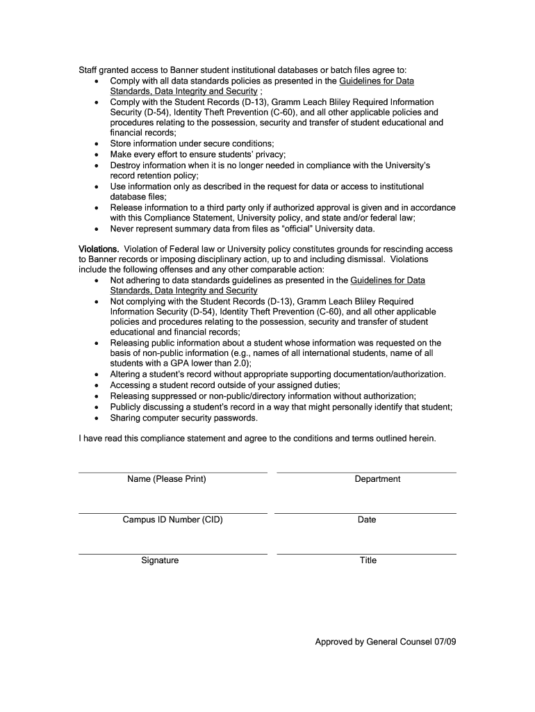 Failure to sign the Banner Privacy & Security Compliance Statement may result in the loss of access to student and financial records and could impact employment status.