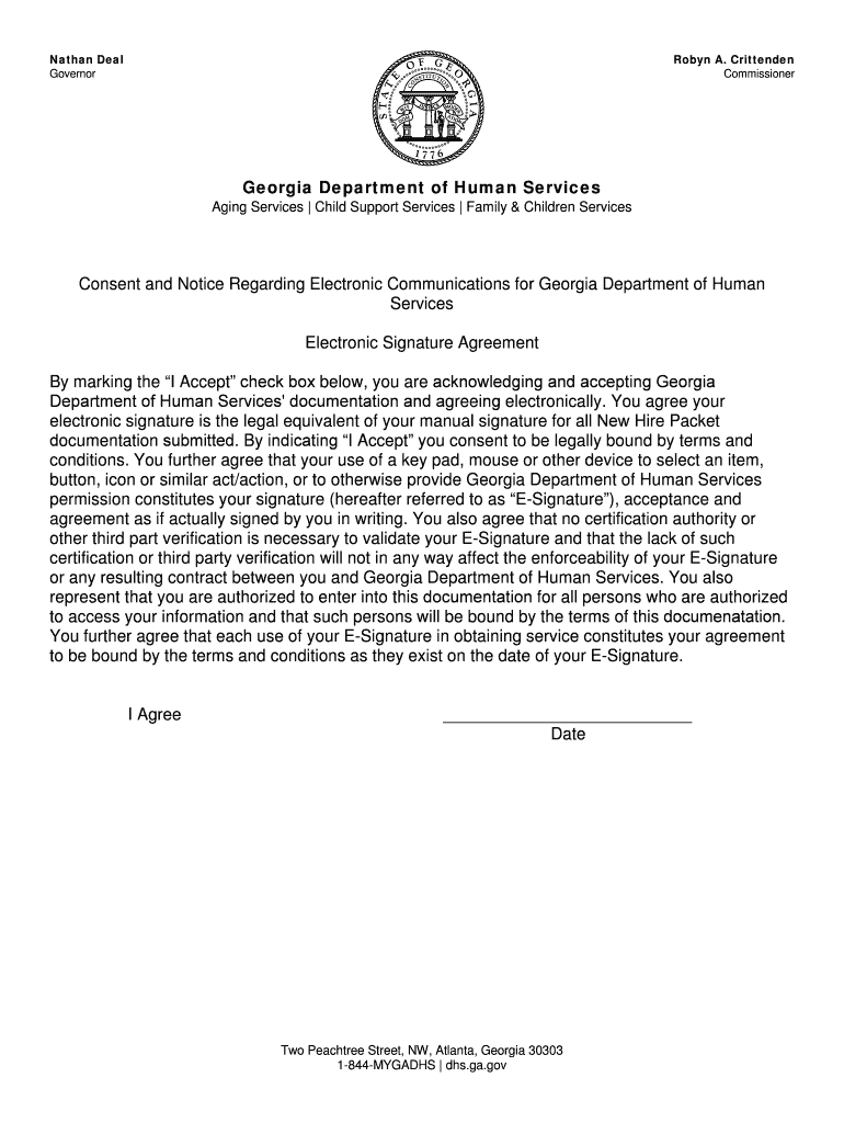 Nathan Deal Governor Robyn A. Christensen Commissioner Georgia Department of Human Services Aging Services Child Support Services Family & Children Services Consent and Notice Regarding Electronic