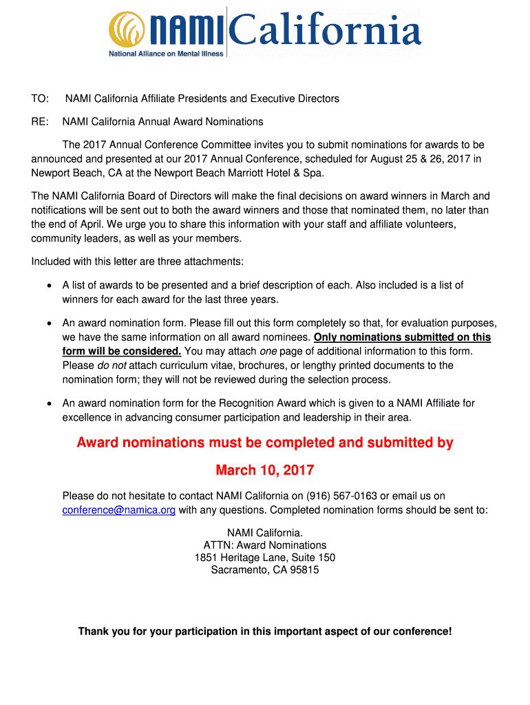 TO: NAME California Affiliate Presidents and Executive Directors RE: NAME California Annual Award Nominations The 2017 Annual Conference Committee invites you to submit nominations for awards to be