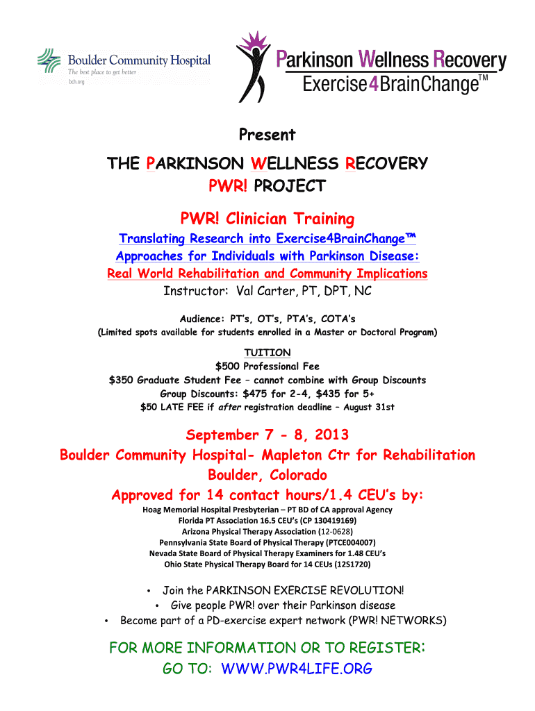 Get the free Present THE PARKINSON WELLNESS RECOVERY PWR! PROJECT PWR ...