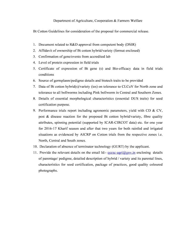 Department of Agriculture, Cooperation & Farmers Welfare BT Cotton Guidelines for consideration of the proposal for commercial release. 1. Document related to R&D approval from competent body (SIR)