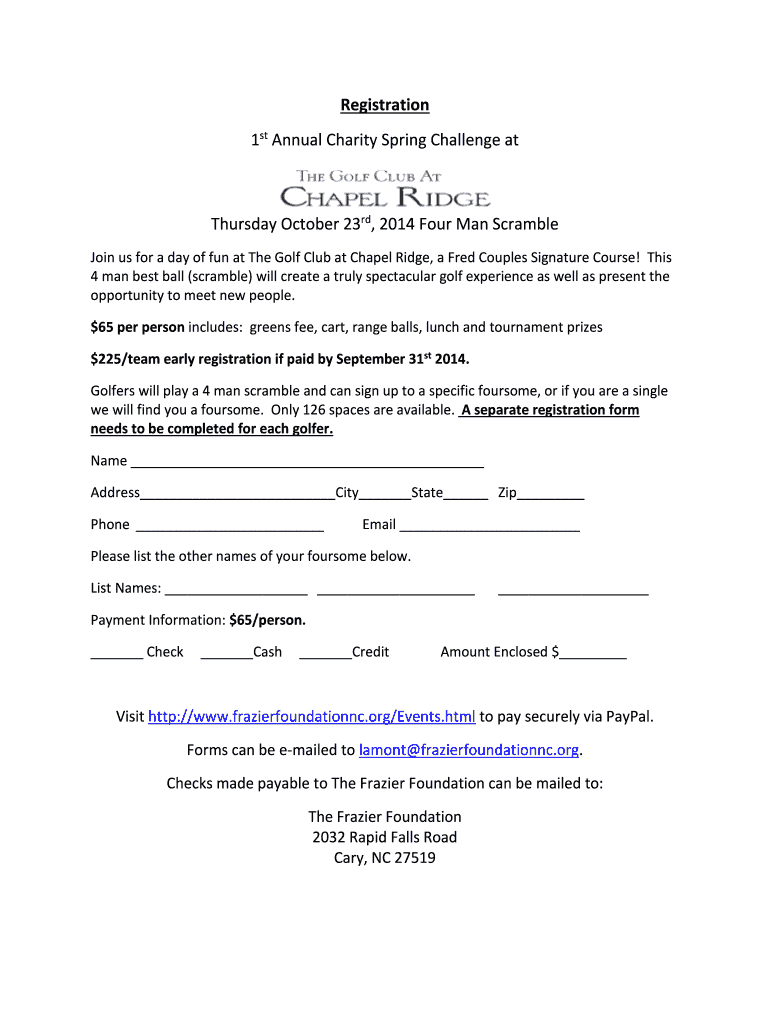 Registration 1st Annual Charity Spring Challenge at Thursday, October 23rd, 2014 Four Man Scramble Join us for a day of fun at The Golf Club at Chapel Ridge, a Fred Couples Signature Course! This
