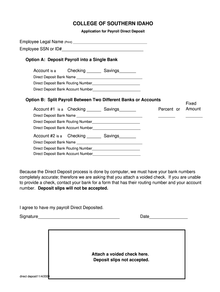 COLLEGE OF SOUTHERN IDAHO Application for Payroll Direct Deposit Employee Legal Name (Print) Employee SSN or ID# Option A: Deposit Payroll into a Single Bank Account is a Checking Savings Direct Deposit
