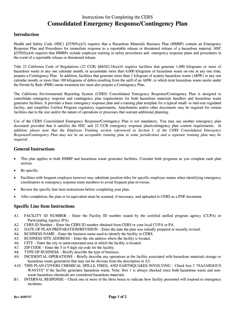 Instructions for Completing the CARS Consolidated Emergency Response/Contingency Plan Introduction Health and Safety Code (HSC) 25505(a)(3) requires that a Hazardous Materials Business Plan (HBP)
