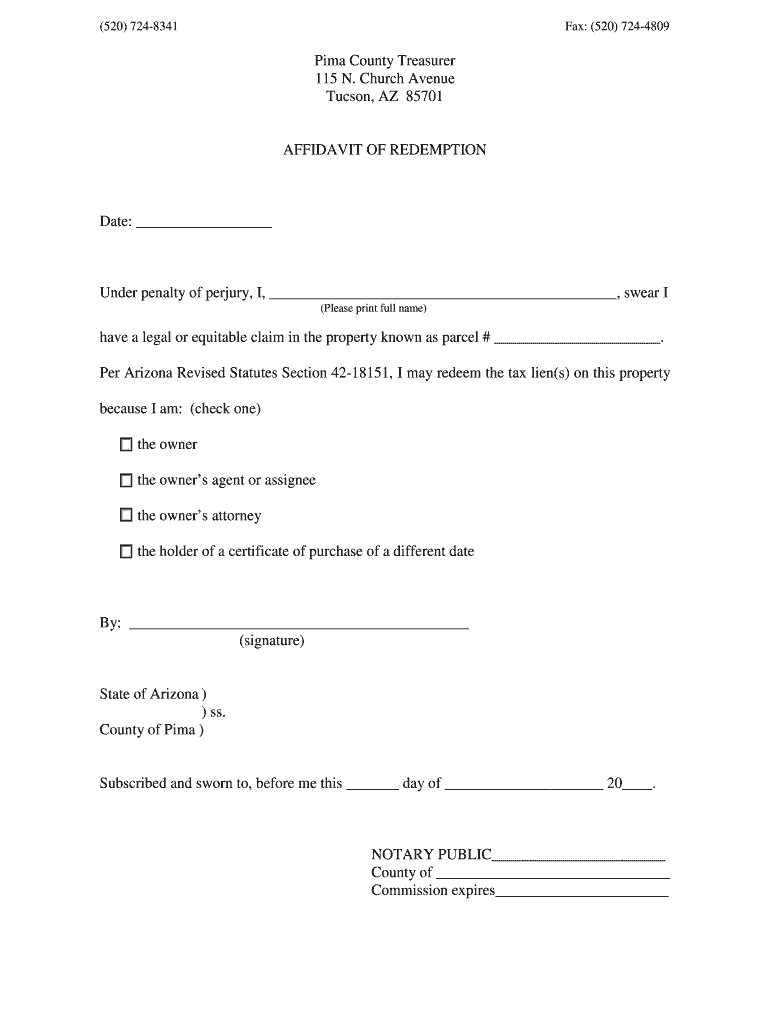 (520) 7248341 Fax: (520) 7244809 Pima County Treasurer 115 N. Church Avenue Tucson, AZ 85701 AFFIDAVIT OF REDEMPTION Date: Under penalty of perjury, I, swear I (Please print full name) have a legal