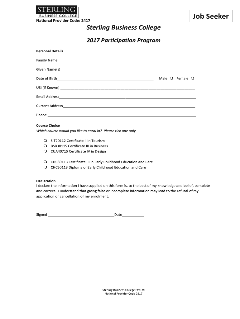 Job Seeker National Provider Code: 2417 Sterling Business College 2017 Participation Program Personal Details Family Name Given Name(s) Date of Birth Male Female USI (if Known) Email Address Current