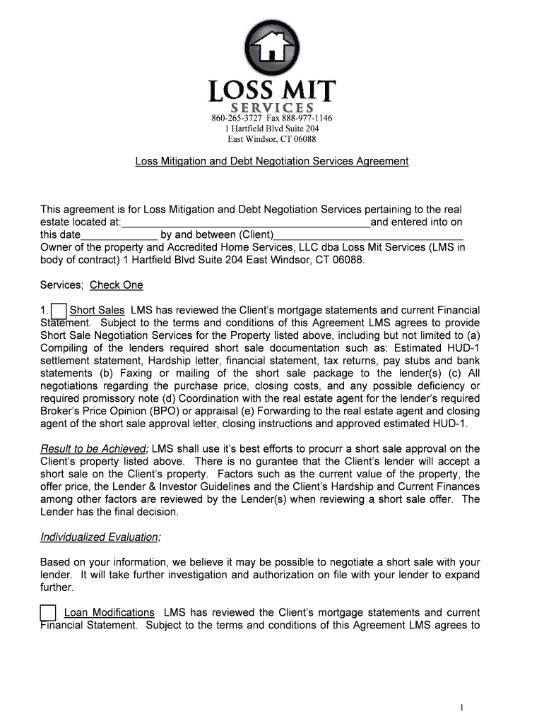8602653727 Fax 8889771146 1 Hatfield Blvd Suite 204 East Windsor, CT 06088 Loss Mitigation and Debt Negotiation Services Agreement This agreement is for Loss Mitigation and Debt Negotiation Services