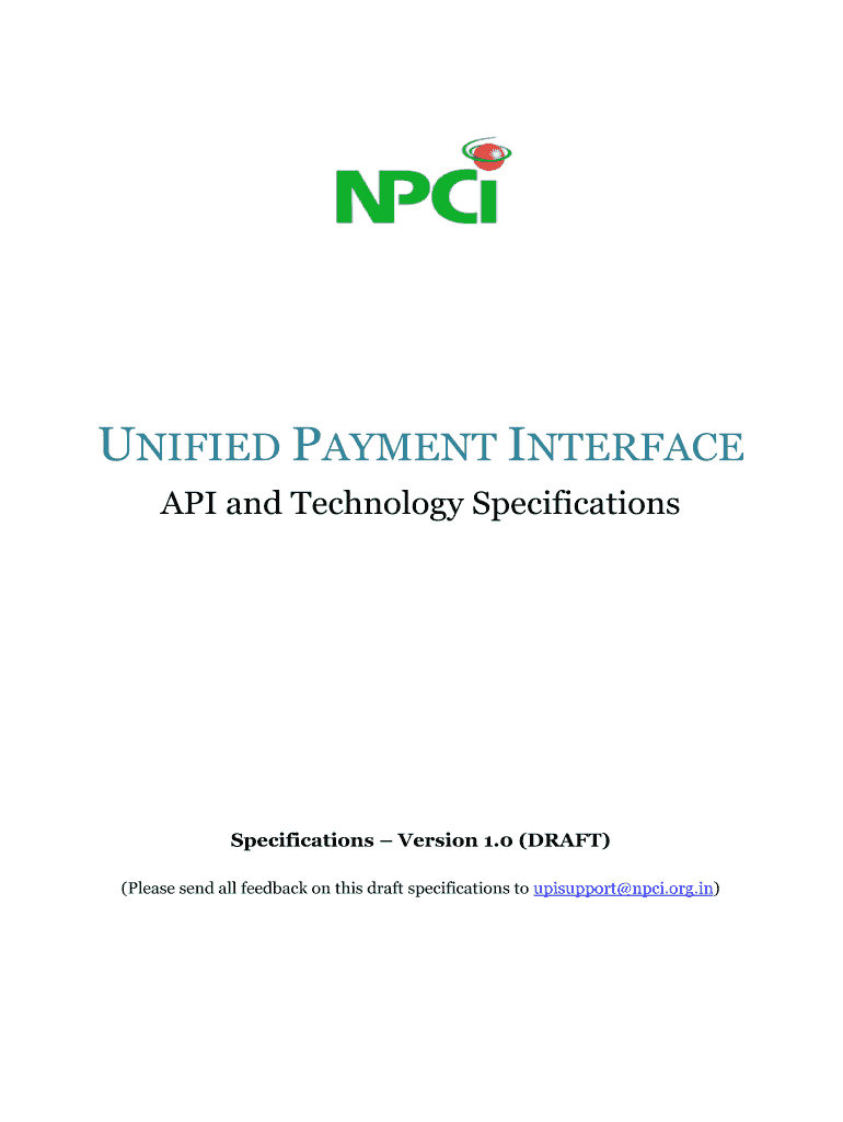 UNIFIED PAYMENT INTERFACE API and Technology SpecificationsSpecifications Version 1.0 (DRAFT) (Please send all feedback on this draft specifications to support PCI.org.in)UNIFIED PAYMENT INTERFACE