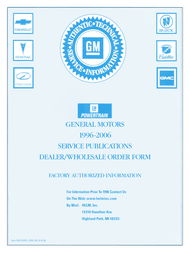 GENERAL MOTORS 19962006 SERVICE PUBLICATIONS DEALER/WHOLESALE ORDER FORM FACTORY AUTHORIZED INFORMATION For Information Prior To 1996 Contact Us On The Web: www.helminc.com By Mail: HELM, Inc. 14310