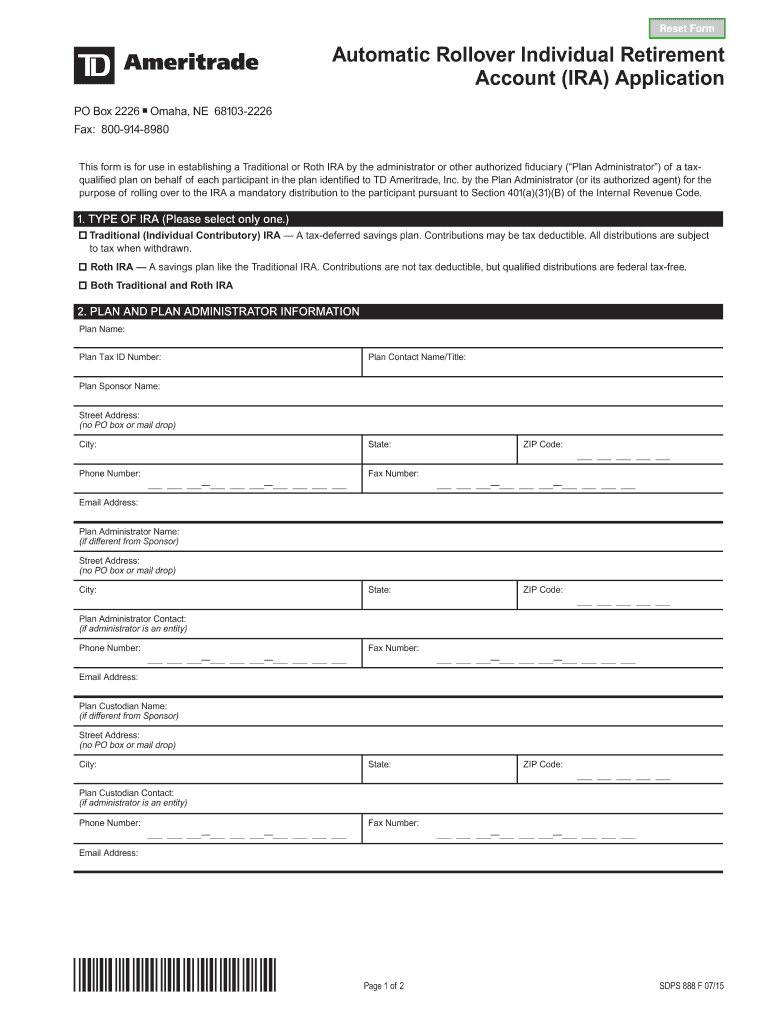 Reset Form Automatic Rollover Individual Retirement Account (IRA) Application PO Box 2226 Omaha, NE 681032226 Fax: 8009148980 This form is for use in establishing a Traditional or Roth IRA by the