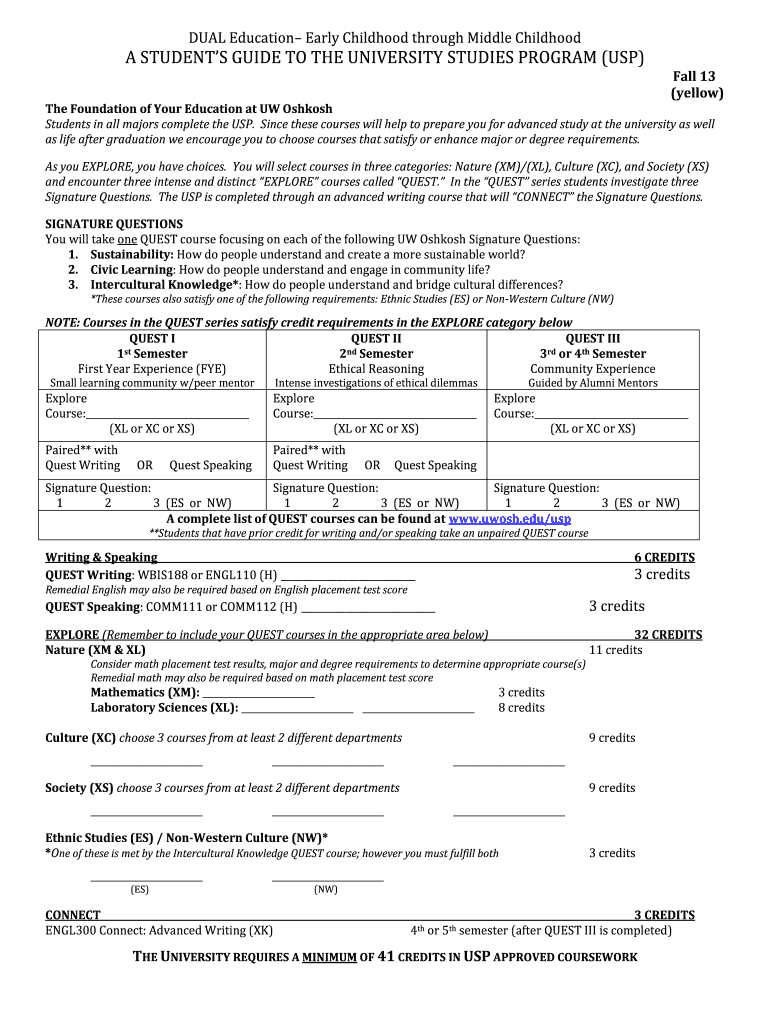 The University Studies Program (USP) Guide serves as an essential resource for students at the University of Wisconsin Oshkosh. This comprehensive document outlines the requirements and components of the Bachelor of Science in Education (BSE) with a Dual Early Childhood Education major. It includes categories such as Nature, Culture, Society, and the QUEST series, aimed at enhancing students' educational experiences.