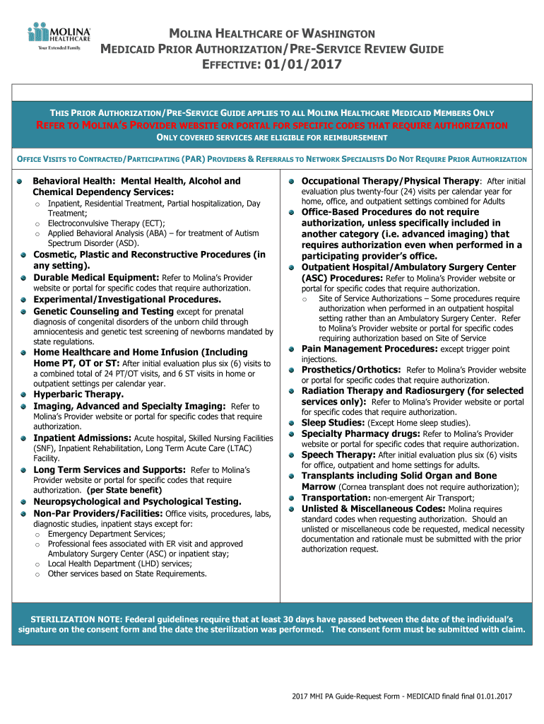 MOLINA HEALTHCARE OF WASHINGTON MEDICAID PRIOR AUTHORIZATION/PRESERVICE REVIEW GUIDE EFFECTIVE: 01/01/2017THIS PRIOR AUTHORIZATION/PRESERVICE GUIDE APPLIES TO ALL MOLINA HEALTHCARE MEDICAID MEMBERS
