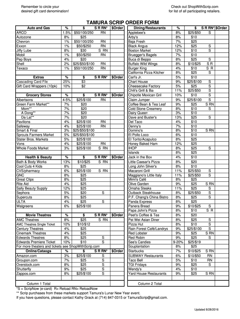 Remember to circle your desired gift card denomination! Check out ShopWithScrip.com for list of all participating retailers. TAMARA SCRIP ORDER FORM Auto and Gas ARC Autozone Chevron Exxon Jiffy Lube
