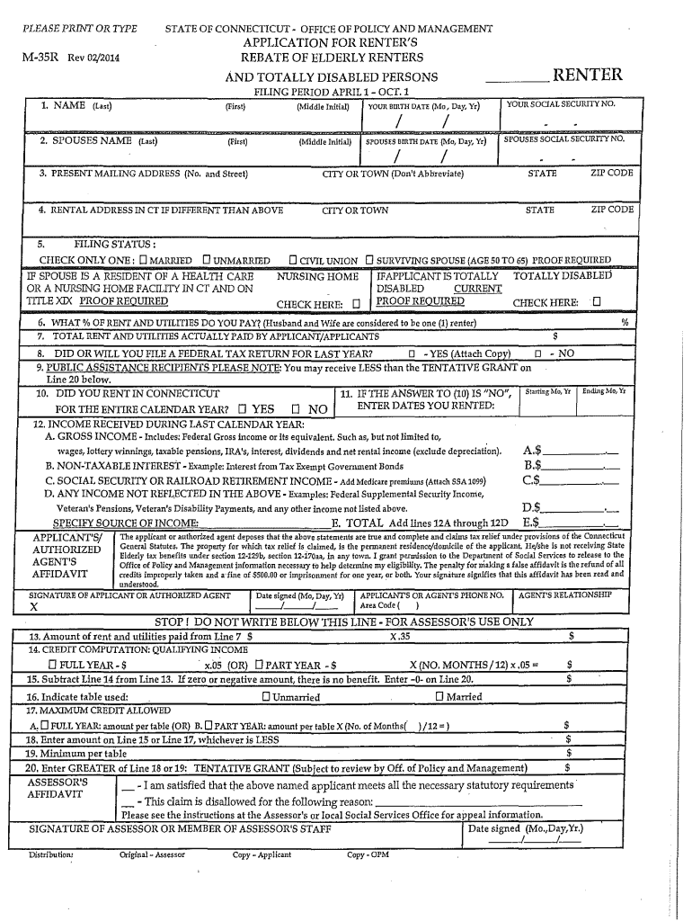 PLEASE PRINT OR TYPE STATE OF CONNECTICUT. OFFICE OF POLICY AND MANAGEMENT APPLICATION FOR RENTER IS REBATE OF ELDERLY RENTERS M35R Rev 0:1/2014 RENTER AND TOTALLY DISABLED PERSONS FILING PERIOD APRIL