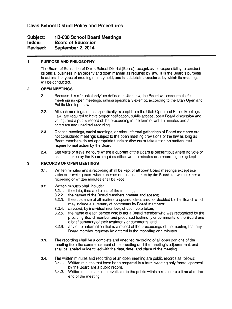 Davis School District Policy and Procedures Subject: Index: Revised: 1. 1B-030 School Board Meetings Board of Education September 2, 2014, PURPOSE AND PHILOSOPHY The Board of Education of Davis School