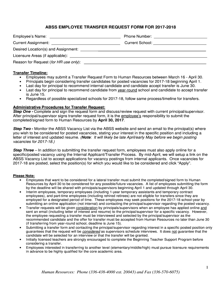 ABYSS EMPLOYEE TRANSFER REQUEST FORM FOR 20172018 Employees Name: Phone Number: Current Assignment: Desired Location(s) and Assignment: Current School: Licensure Areas (if applicable): Reason for