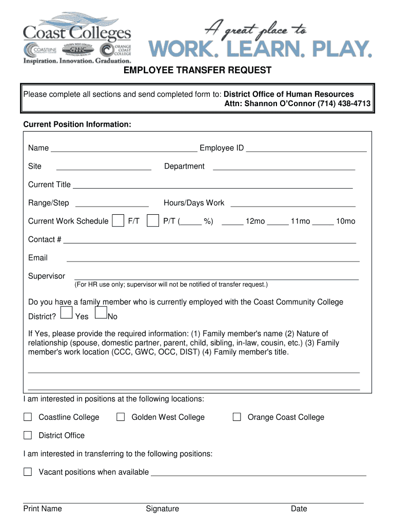 EMPLOYEE TRANSFER REQUEST Please complete all sections and send completed form to: District Office of Human Resources Attn: Shannon O'Connor (714) 4384713 Current Position Information: Name Employee