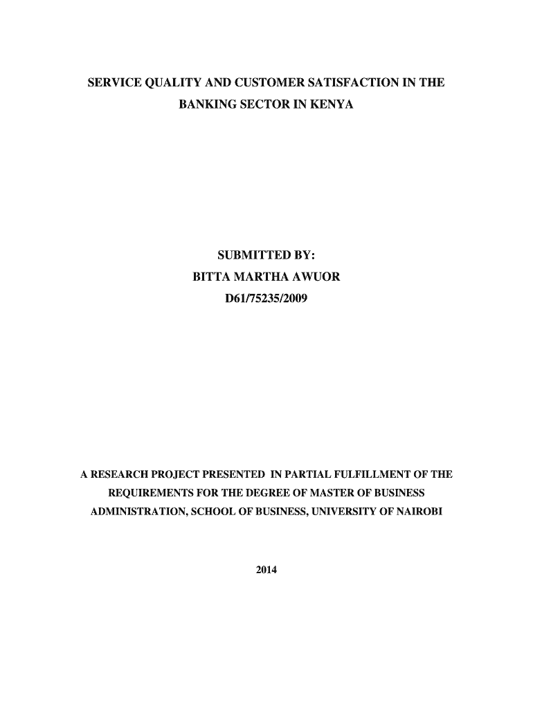 SERVICE QUALITY AND CUSTOMER SATISFACTION IN THE BANKING SECTOR IN KENYA SUBMITTED BY: PITTA MARTHA AWU OR D61/75235/2009 A RESEARCH PROJECT PRESENTED IN PARTIAL FULFILLMENT OF THE REQUIREMENTS FOR