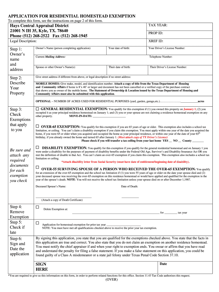 APPLICATION FOR RESIDENTIAL HOMESTEAD EXEMPTION To complete this form, see the instructions on page 2 of this form. TAX YEAR: Hays Central Appraisal District 21001 N IH 35, Kyle, TX. 78640 Phone (512)