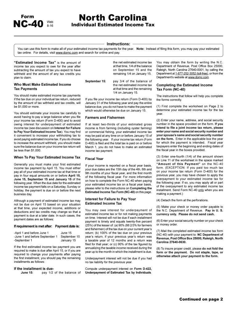 Form NC40 Web 816 North Carolina Individual Estimated Income Tax Instructions: You can use this form to make all of your estimated income tax payments for the year. Note: Instead of filing this form,