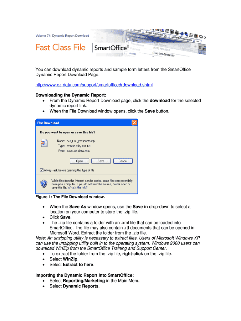 You can download dynamic reports and sample form letters from the SmartOffice Dynamic Report Download Page: http://www.ezdata.com/support/smartofficedrdownload.shtml Downloading the Dynamic Report: