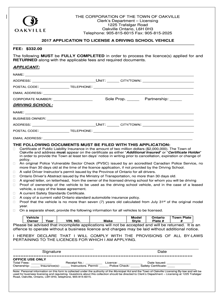 THE CORPORATION OF THE TOWN OF OAKVILLE Clerks Department Licensing 1225 Trafalgar Road Oakville Ontario, L6H 0H3 Telephone: 9058156015 Fax: 9058152025 2017 APPLICATION TO LICENSE A DRIVING SCHOOL