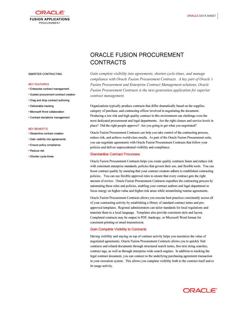 Get the free Oracle Fusion Procurement Contracts Data Sheet. Oracle Fusion Procurement Contracts ...