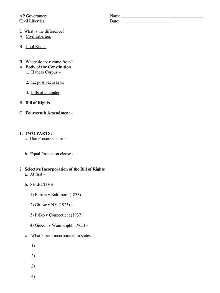 AP Government Civil Liberties I. What is the difference? A. Civil Liberties B. Civil Rights II. Where do they come from? A. Body of the Constitution 1. Habeas Corpus 2. Ex post Facto laws 3. Bills