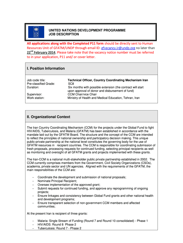 UNITED NATIONS DEVELOPMENT Program JOB DESCRIPTION All applications along with the Completed P11 form should be directly sent to Human Resources Unit of GFA TM/UNDP through email ID: vacancy.IR UNDP.org